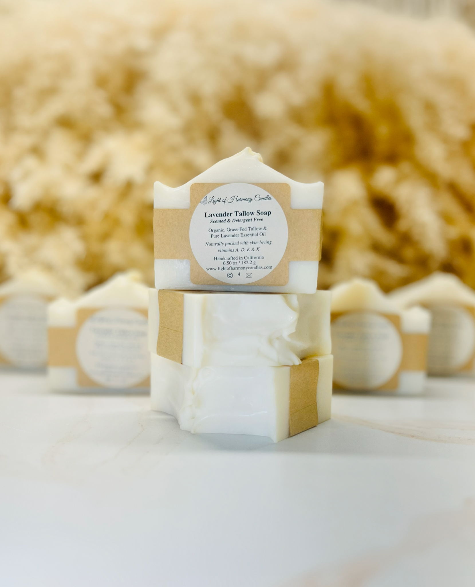 Experience the ultimate in natural skincare with our handcrafted Lavender Tallow Soap, made with organic, grass-fed tallow and pure lavender essential oil. Naturally rich in Vitamins A, D, E and K, this nourishing tallow soap helps hydrate, protect, and restore the skin, leaving it soft, smooth, and delicately scented with calming lavender.